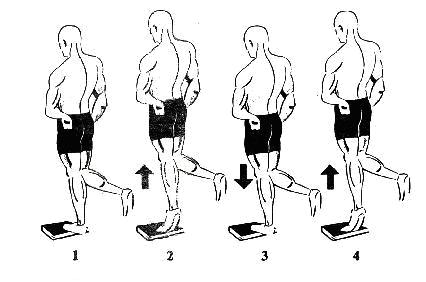 Step1. ยืนบนหนังสือ หรือ ขั้นบันไดด้วนครึ่งเท้า พับขาขึ้นข้างหนึ่ง ทิ้งนำหนักตัวลงที่ขาข้างที่เหยียบ
