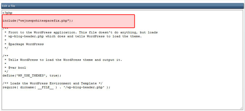 - ใส่โค้ด include(“wejnswpwhitespacefix.php”); ลงไปในส่วนหัวของไฟล์ตามรูปครับ จากนั้น Save แล้วลองไป Refresh เว็บไซต์ดูครับ